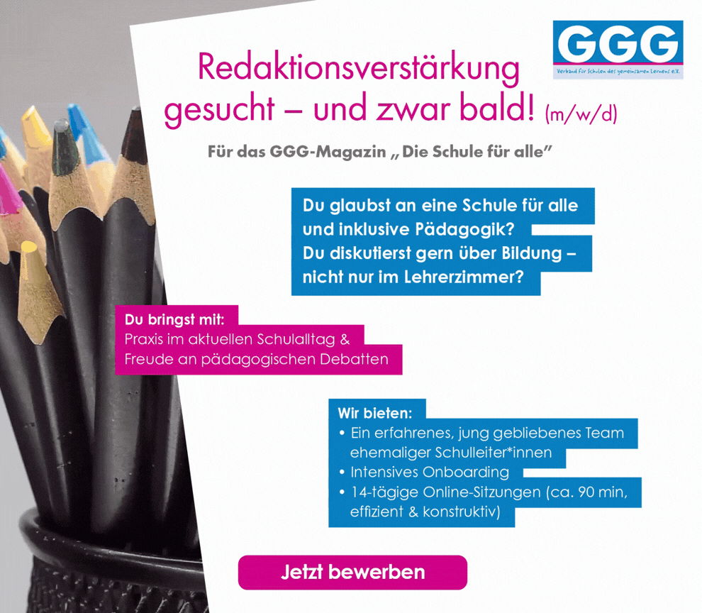 Seit 2020 erscheint das GGG-Magazin „Die Schule für alle“. Dieses Magazin erscheint in der Regel zwei Mal im Jahr und wird allen Mitgliedern im...