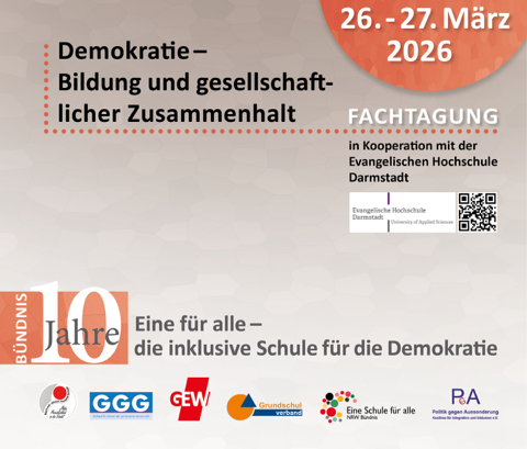 Save the Date! 10 Jahre Bündnis eine für alle – die inklusive Schule für die Demokratie Donnerstag, 26. März, bis Freitag, 27. März 2026 Termin...