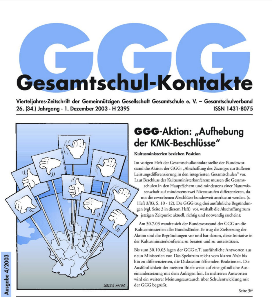 Gesamtschul-Kontakte (Heft 4-2003) – (das ganze Heft als PDF) Thema GGG-Aktion „Aufhebung der KMK-Beschlüsse“: Kultusministerien beziehen Position Bildungspolitik Lehrerfortbildung bei der GGG GGG-Aktuell „Es darf keine Verlierer geben“ GGG-Intern Klausurtagung des Bundesvorstandes in Stedesdorf Unterrichts-Projekte Die IGS Koblenz-Pollenfeld – eine Schule der Begabungsvielfalt Aus den Ländern Kommentar Standards – so nicht!
