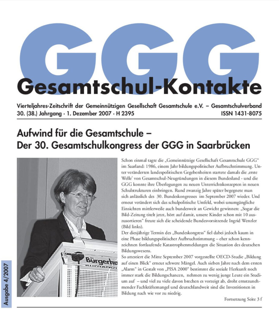 Gesamtschul-Kontakte (Heft 1-2007) – (das ganze Heft als PDF) INHALT: Gesamtschulkongress Aufwind für die Gesamtschule Erziehung und Gerechtigkeit GGG Intern GGG-Mitgliederversammlung Wie es weitergehen kann Der neue GGG Bundesvorstand stellt sich vor GGG-Aktuell AK KMK der GGG Aus den Ländern Friedel Derscheid ist tot Kommentar
