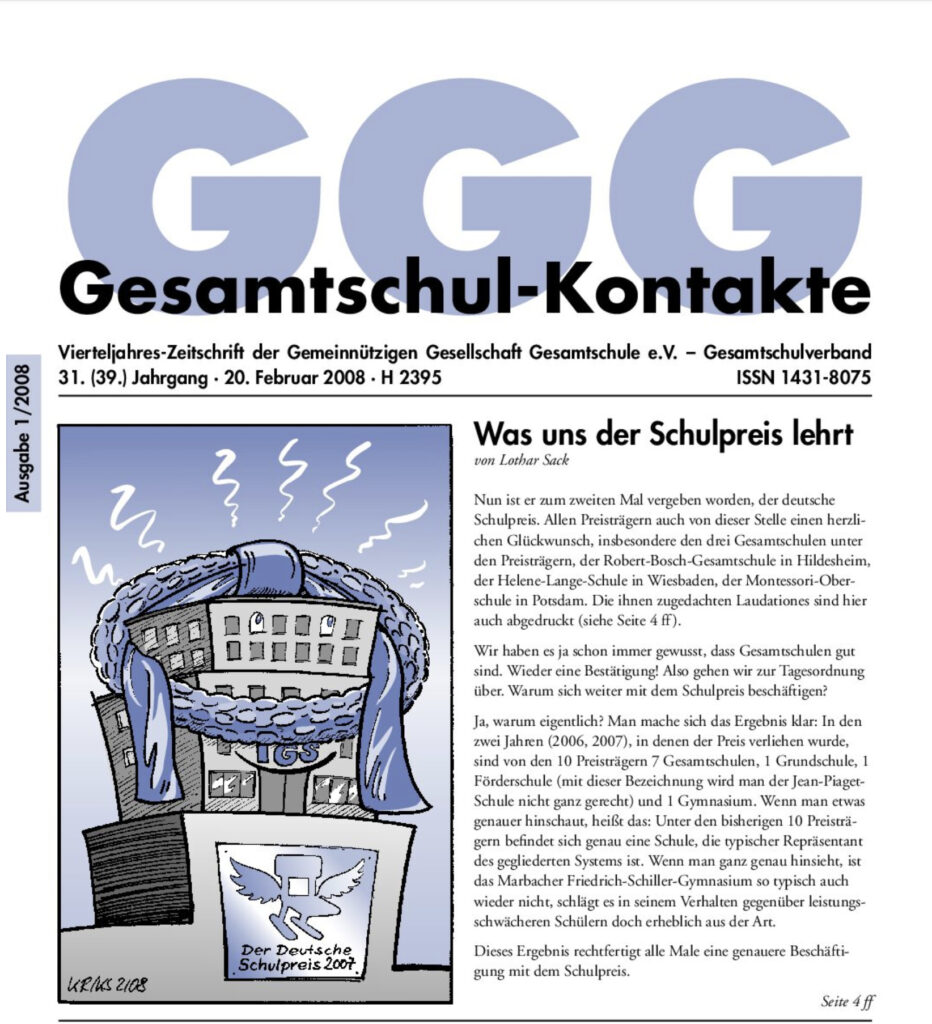 Gesamtschul-Kontakte (Heft 1-2008) – (das ganze Heft als PDF) INHALT: Bildungs-Politik Warum muss man dafür kämpfen Thema Was uns der Schulpreis lehrt Beispielhafte Projekte Das HT-Konzept (heterogene Tischgruppen) der IGS Koblenz-Pollenfeld GGG Intern Hauptaussschuss tagt in Unna Aus den Ländern Kommentar Kommentar