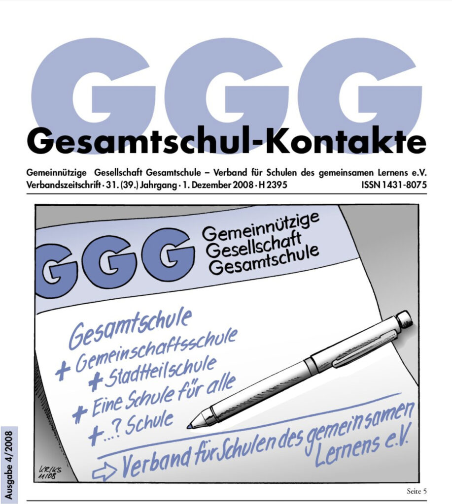 Gesamtschul-Kontakte (Heft 4-2008) – (das ganze Heft als PDF) INHALT: GGG-Intern Alte Schmiede Stedesdorf nun Bundesgeschäfsstelle GGG-Aktuell „Das ist wie Schweden in Deutschland“ Die GGG öffnet sich Grundsatzposition Stiftung in der GGG Schülerdemos für bessere Bildung Thema Auf der Suche nach dem individuellen Profil Serie Organisationsskizzen Organisationsskizze Fritz-Karsen-Schule in Berlin-Neukölln […]