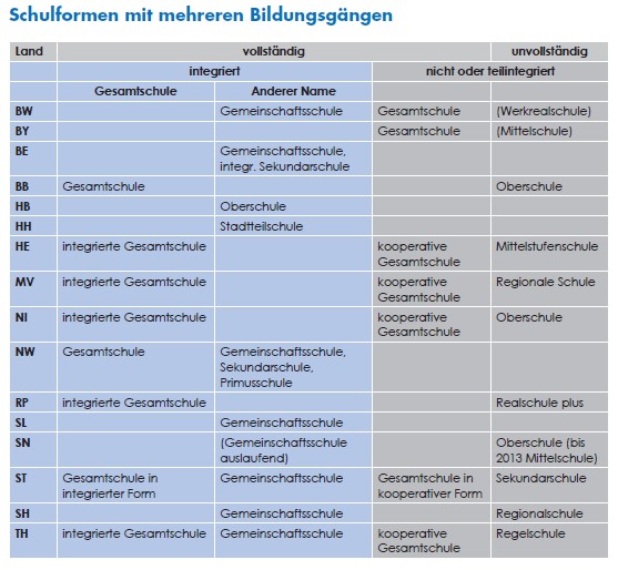 Wofür stehen welche Schulbezeichnungen? Vor 2005 gab es im öffentlichen Schulwesen fast nur vollständige integrierte Schulen (s. Anmerkung), die Gesamtschule hießen; das traditionelle gegliederte Schulwesen existierte vornehmlich in den westlichen Bundesländern. Heute im Schuljahr 2013/14 verfügt nur eine Minderheit der Bundesländer noch über die Schulformen der klassischen Gliedrigkeit: Baden-Württemberg (BW), Bayern (BY), Hessen (HE), Niedersachsen […]