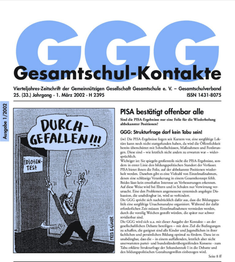 Gesamtschul-Kontakte (Heft 1-2001) – (das ganze Heft als PDF) INHALT: GGG-Serie Zur Schulleistungsforschung Wenzler: „PISA-Vorstudie untermauert Forderung nach gemeinsamer Schule für alle“ 3 GGG – GSV Fachtagung 4 Gemeinsame Grundsatzposition von GGG und GSV 5 Gesamtschul-Kontakte-Gespräch mit…