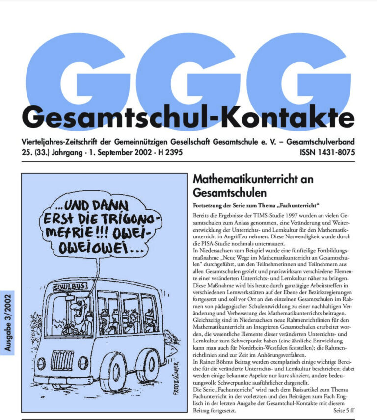 Gesamtschul-Kontakte (Heft 3-2002) – (das ganze Heft als PDF) INHALT: Bildungs-Politik Mit 15 bist du waffenreif! Serie Fachunterricht Mathematikunterricht an Gesamtschulen PISA E Erste Ergebnisse und Folgerungen aus PISA E GGG aktuell Hamburg: Angriff auf die Gesamtschule…