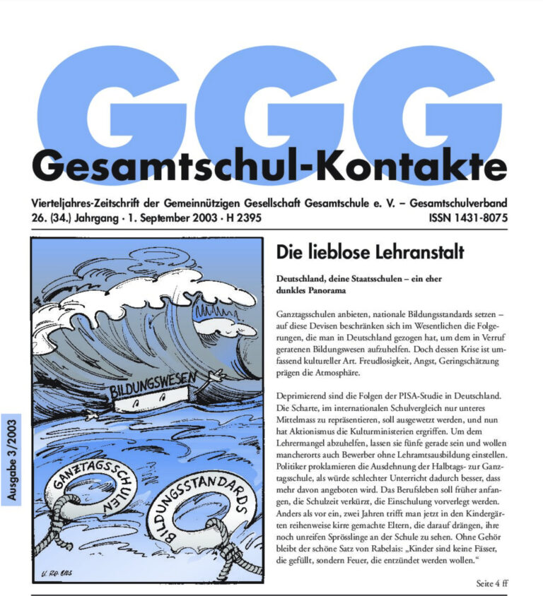 Gesamtschul-Kontakte (Heft 4-2003) – (das ganze Heft als PDF) Thema GGG-Aktion „Aufhebung der KMK-Beschlüsse“: Kultusministerien beziehen Position Bildungspolitik Lehrerfortbildung bei der GGG GGG-Aktuell „Es darf keine Verlierer geben“ GGG-Intern Klausurtagung des Bundesvorstandes in Stedesdorf Unterrichts-Projekte Die IGS…