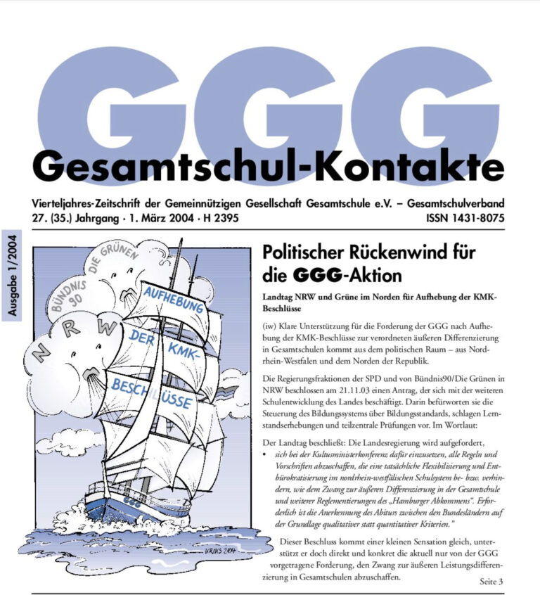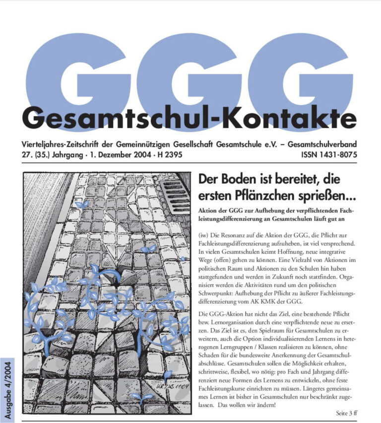 Gesamtschul-Kontakte (Heft 1-2004) – (das ganze Heft als PDF) INHALT: Thema Aufhebung der KMK-Beschlüsse: Politischer Rückenwind für die GGG GGG – GSV IGLU: Das Ergebnis des Ländervergleichs war zu erwarten „Länger gemeinsam Lernen“ Bildungspolitik „Nationale Bildungsstandards“ –…
