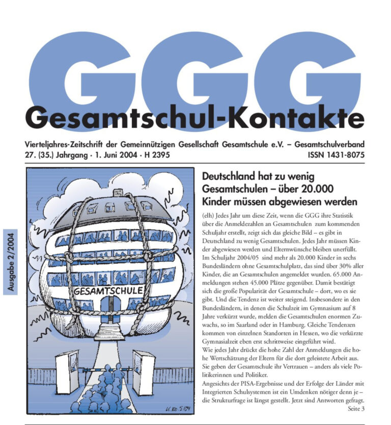 Gesamtschul-Kontakte (Heft 2-2004) – (das ganze Heft als PDF) INHALT: GGG Aktuell Gesamtschule 2004/05: 65.000 Anmeldungen – 45.000 Plätze Bildungspolitik „Wir müssen die Schule darin unterstützen, eigene Wege zur Erreichung der Bildungsstandards zu suchen“ Die GGG im…
