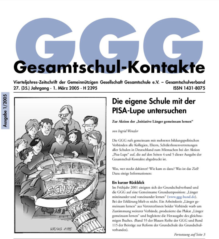 Gesamtschul-Kontakte (Heft 1-2005) – (das ganze Heft als PDF) INHALT: Thema PISA-Lupe: Zur Aktion der „Initiative Länger gemeinsam lernen“ Die eigene Schule mit der „PISA-Lupe“ untersuchen GGG Aktuell 29. Gesamtschulkongress der GGG Serie Bildungsstandards im Fach Mathematik…