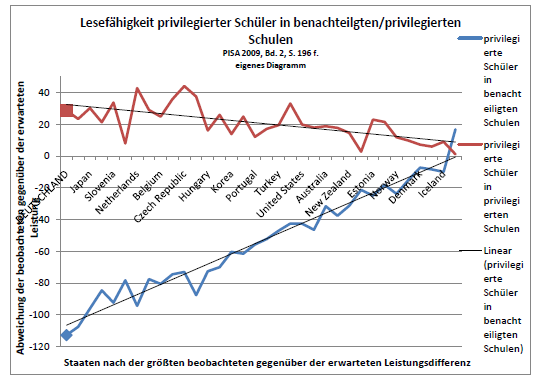 Das PISA-Konsortium untersuchte die Leseleistungen des jeweiligen niederen und oberen sozialen Viertels der Schülerschaft. Es verglich ihre durchschnittliche Leistung mit der Leistung je nachdem, ob sie eine sozial benachteiligte oder sozial bevorzugte Schule besuchten.