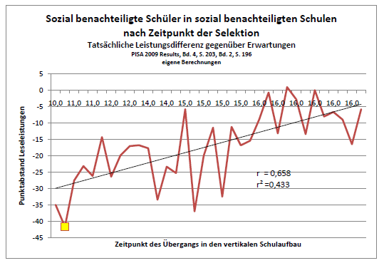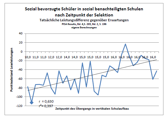 Der Zeitpunkt des Übergangs in den vertikalen Schulaufbau bestimmt maßgeblich den Umfang der Diskriminierung in den benachteiligten Schulen. Gut 40 % des Leistungsabfalls von Schülern in sozial benachteiligten Schulen geht allein auf den Zeitpunkt der Trennung in verschiedene Schulformen zurück. Das gilt nicht nur für die benachteiligten, sondern auch für die sozial privilegierten Schüler/innen: