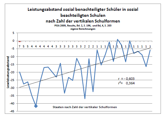 Die Leistungsunterschiede zwischen den Staaten sind erheblich. In manchen Staaten – wie Finnland, Island oder Polen – unterscheiden sich die Leistungen je nach besuchter Schule im Durchschnitt nicht. In anderen Staaten sind die Differenzen dramatisch. Am schlimmsten sind sie in Deutschland. Hier bleibt ein sozial benachteiligter Schüler in seiner Leistung in einer sozial benachteiligten Schule – fast ausschließlich Förderschule oder Hauptschule – um 42 Punkte – das ist mehr als ein Schuljahr – zurück. In einer sozial bevorzugten Schule – einem Gymnasium – gewinnt er stattdessen 103 Punkte- das sind mehr als zweieinhalb Schuljahre – immer gegenüber der durchschnittlichen Leistung sozial benachteiligter Schüler/innen. Im neunten Schuljahr macht der Leistungsunterschied fast vier Schuljahre aus, je nachdem, ob ein Jugendlicher eine sozial privilegierte oder eine benachteiligte Schule besucht. Umgekehrt entwickelt sich ein sozial bevorzugter Schüler.