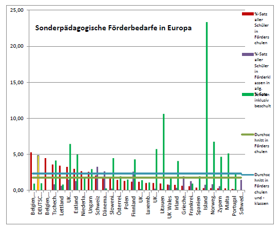 Das Diagramm zeigt, dass der Förderbedarf ganz unterschiedlich eingeschätzt wird. Allerdings wird zumeist integrativ gefördert. Eine so umfangreiche Aussonderung in Förderschulen wie in Deutschland besteht nur noch in Flamen. In Europa liegt der Förderschulbesuch durchschnittlich bei knapp der Hälfte und unter Berücksichtigung der Förderklassen an allgemeinen Schulen bei der Hälfte. Es gibt Staaten, die grundsätzlich auf Förderschulen und einige auch zusätzlich auf Förderklassen verzichten.