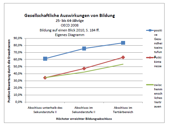 Der höhere Bildungsstand führt auch zu stärkerem zwischenmenschlichen Vertrauen und zu größerem politischen Interesse – die Integration in und die politische Teilhabe an der Gesellschaft steigt beachtlich. Und der besser Ausgebildete lebt und fühlt sich gesunder, er ist zufriedener. Die wohl beste Mitgift von Eltern für ihre Kinder ist eine qualifizierte Ausbildung.