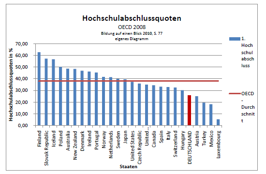 Durchschnittlich machen innerhalb der OECD 60 % eines Jahrganges ein Abitur, in Österreich sind es nicht einmal 20 %, in Finnland sind es über 90 %, in Irland sogar 99 % eines Jahrganges. Die Hochschulreife für die Mehrheit ist in den meisten OECD-Staaten inzwischen Realität. In bildungspolitisch führenden Staaten wie Irland und Finnland wird oder ist die Hochschulreife bereits der generelle Abschluss. In diesen Staaten ist der Anteil von Jugendlichen ohne Hochschulreife nicht höher als in Deutschland der Anteil von Jugendlichen ohne Hauptschulabschluss.