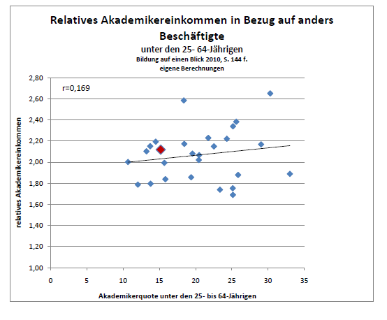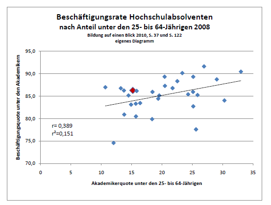 Die Befürchtung, je mehr Akademiker, desto prekärer ihre Beschäftigung – erweist sich als falsch, das Gegenteil ist richtig: Je mehr Akademiker, desto höher ist innerhalb der OECD im Durchschnitt ihre Erwerbstätigkeit. Die mathematische Beziehung ist eng. Bildung ist also eine Investition, die sich lohnt – für die Beschäftigung des Einzelnen wie auch für den Staat. Höhere Bildung schafft sich also mehr Beschäftigung, das gilt grundsätzlich, es gibt Ausnahmen für brotlose Studiengänge. Auch Schwellenländer wie die Türkei und Korea haben Beschäftigungsprobleme bei den Hochschulabsolventen, aber diese sind selbst in diesen Staaten durchschnittlich deutlich geringer als bei Personen mit geringeren Qualifikationen.