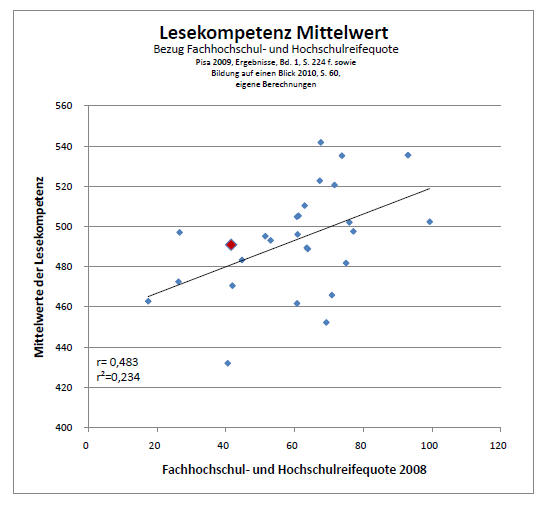 Die durchschnittliche Lesekompetenz unterscheidet sich sehr stark, sie weicht zwischen den Staaten um gut 100 Punkte ab, das entspricht einer Differenz von 2 ½ Schuljahren. Sie steigt deutlich mit steigender Akademikerquote an. Breitenförderung geht also nicht zu Lasten der Leistung, die Lesetestergebnisse zeigen das Gegenteil: Die meisten Staaten schaffen es: Mit stärkerer Breitenbildung steigt im Allgemeinen die Leistung.