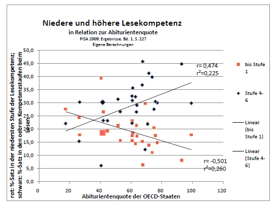 Doch ist es überhaupt denkbar, dass eine deutlich größere Chancengleichheit nicht zu Lasten der Leistung geht? Muss nicht die durchschnittliche Leistung, vor allem aber die der Leistungsstärkeren sinken und können die Schwächsten mithalten? Einen internationalen Leistungsvergleich für die 18-Jährigen gibt es nicht, wir müssen uns mit den PISA-Ergebnissen für die 15-Jährigen begnügen. Die folgenden Ausführungen beziehen sich auf die Ergebnisse 2009 bei der Lesekompetenz, weil diese am wichtigsten und auch am differenziertesten ausgewertet wurde, sowie auf die Abiturientenquote von 2008.